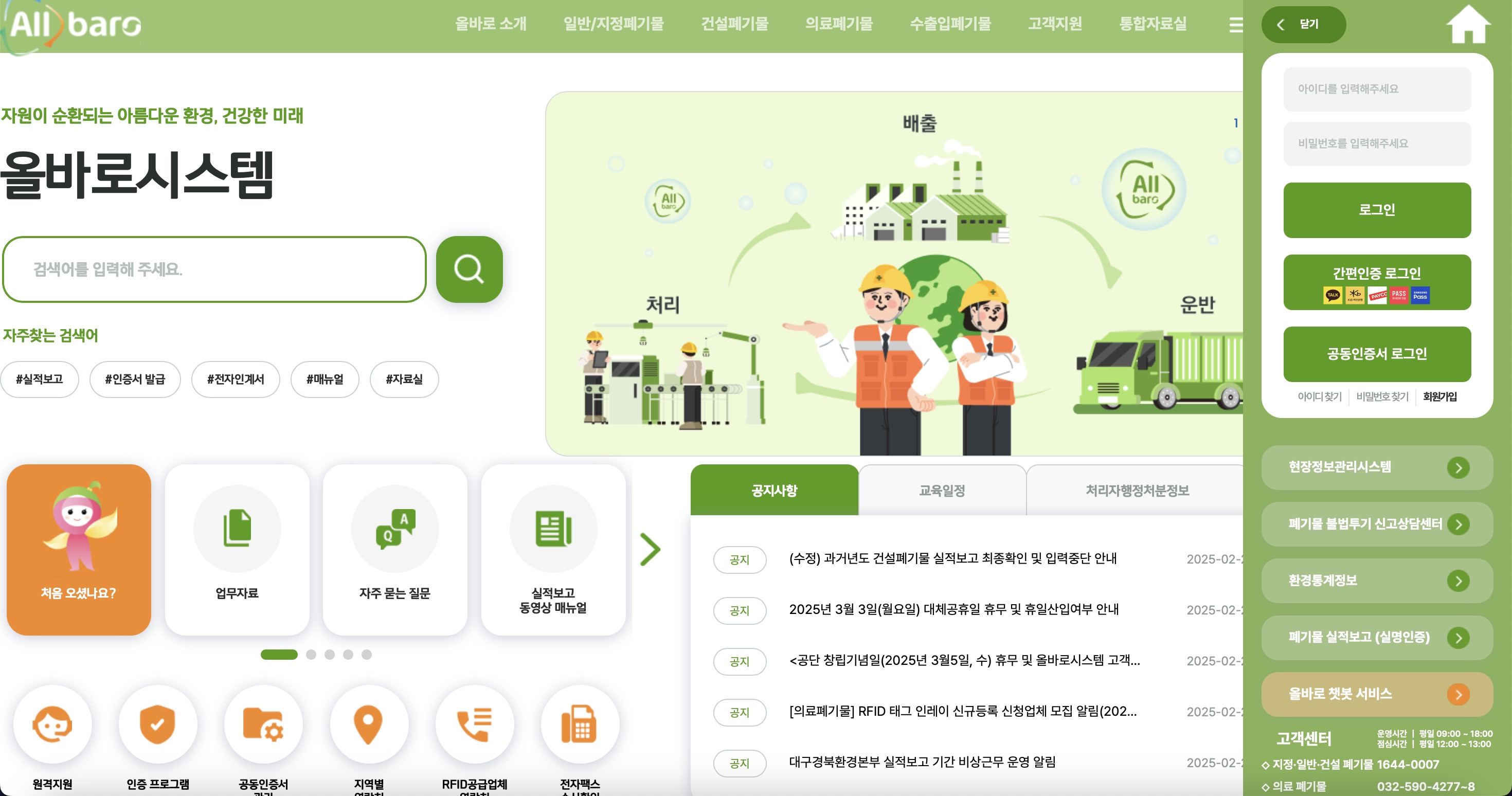 올바로(Allbaro) 시스템은 폐기물의 배출부터 운반, 최종 처리까지 전 과정을 인터넷으로 관리하는 종합 시스템입니다. 이 시스템을 통해 폐기물 발생 억제, 재활용 촉진 및 적정 처리를 효율적으로 수행할 수 있으며, 폐기물 관련 실적보고도 간편하게 진행할 수 있습니다. 아래에서는 올바로시스템을 이용한 폐기물 실적보고 방법과 주요 기능을 자세히 소개해 드리려고 하니 목차를 참고하셔서 필요하신 부분만 발췌하시기 바랍니다.목차올바로시스템 소개주요 기능실적보고 이용 절차실적보고 동영상 매뉴얼결론 및 참고사항올바로시스템 소개올바로시스템은 폐기물의 배출, 운반, 최종 처리 과정을 전산화하여 투명하고 신속하게 관리할 수 있도록 지원하는 플랫폼입니다. 이 시스템을 통해 폐기물 관리 전반의 효율성을 높이고, 환경 보호..
